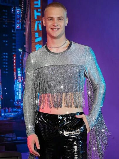 SHEIN Manfinity Fever City Men Fringe Trim Crop Glitter Tee
